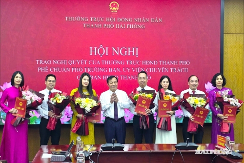 Đồng chí Lê Văn Hiệu, Phó Bí thư Thành uỷ, Chủ tịch HĐND thành phố Hải Phòng trao nghị quyết, tặng hoa chúc mừng các đồng chí được phê chuẩn làm Ủy viên hoạt động chuyên trách tại các Ban của HĐND thành phố khoá XVII, nhiệm kỳ 2026 - 2031. |