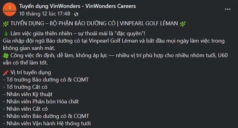 Các quyền lợi nội bộ khác như vui chơi miễn phí tại VinWonders hay Vinpearl Safari cũng được áp dụng cho khối nhân sự này. Động thái tuyển dụng với dải lương và phúc lợi rõ ràng này cho thấy chiến lược thu hút nhân sự bài bản của các doanh nghiệp vận hành sân golf chuyên nghiệp, trong bối cảnh thị trường lao động phổ thông đang đòi hỏi mức đãi ngộ ngày càng cao để đảm bảo tính ổn định của bộ máy vận hành.
