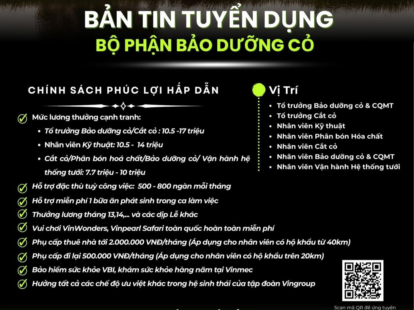 Đợt tuyển dụng này tập trung vào bộ phận bảo dưỡng cỏ với dải nhân sự rộng, từ nhân viên kỹ thuật, vận hành hệ thống tưới, nhân viên phân bón hóa chất đến các vị trí cắt cỏ và bảo dưỡng cảnh quan môi trường.
