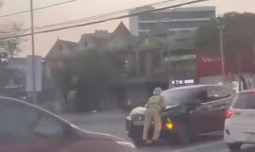 Chiều 20-10, trên mạng xã hội xôn xao clip ghi lại cảnh một chiến sĩ Cảnh sát giao thông thuộc Tổ số 4, địa bàn phường Trường Vinh (Nghệ An) phải bám chặt trên nắp ca-pô của xe ô tô con trong khi xe chạy hàng chục mét trên đường.