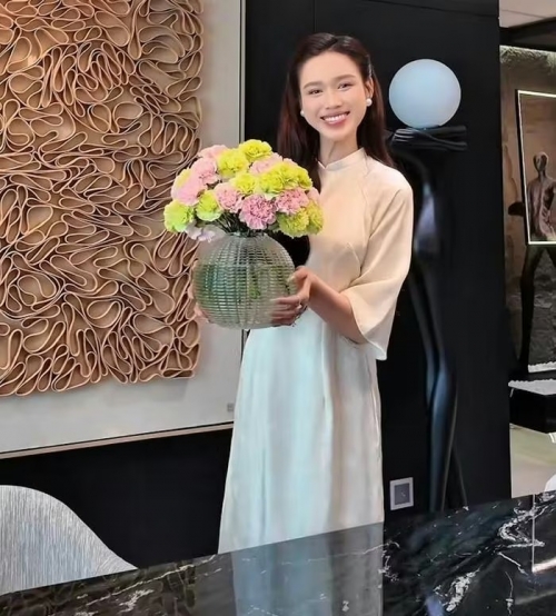 Đỗ Thị Hà tranh thủ học cắm hoa khi khoe áo dài diện trong Tết đầu tiên khi làm dâu hào môn. |