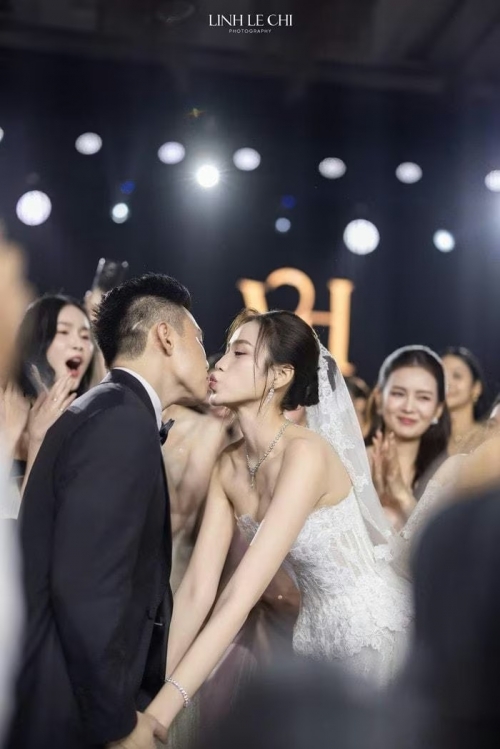 Khoảnh khắc tình tứ của vợ chồng Đỗ Thị Hà trong đám cưới. |