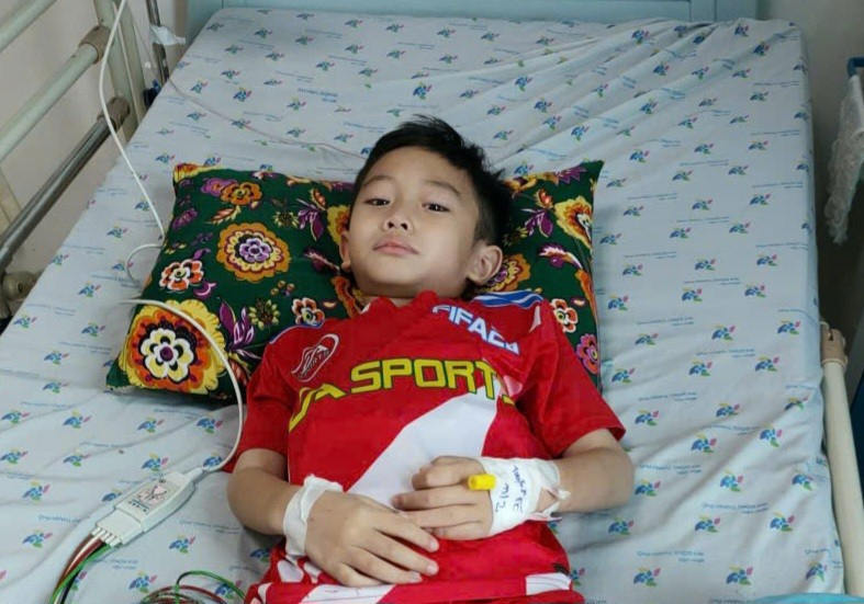 Bé Phạm Quốc Trọng (học sinh lớp 1) đang điều trị tại Bệnh viện Nhi đồng TPHCM. |