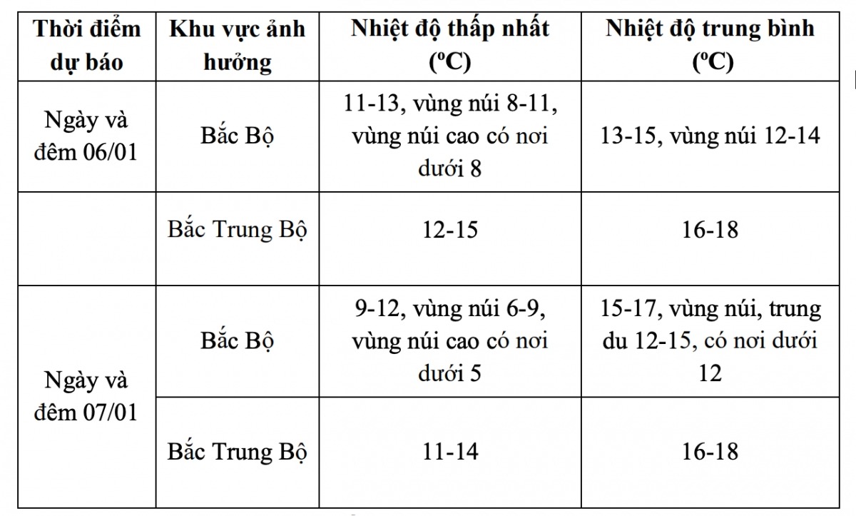Ở khu vực Bắc Bộ trời rét đậm, vùng núi có nơi rét hại; Bắc Trung Bộ trời rét, có nơi rét đậm. Nhiệt độ thấp nhất trong đợt không khí lạnh này ở khu vực Bắc Bộ, Thanh Hóa và Nghệ An phổ biến từ 9-12 độ, vùng núi Bắc Bộ 6-9 độ, vùng núi cao có nơi dưới 5 độ.