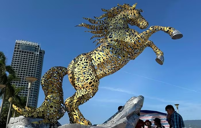 Linh vật ngựa sắt vàng được ghép bằng tên 94 xã, phường, đặc khu Hoàng Sa và tên Thành phố Đà Nẵng đặt trước khu vực trung tâm hành chính thành phố, cạnh bờ sông Hàn. (Ảnh: Báo Nhân Dân)