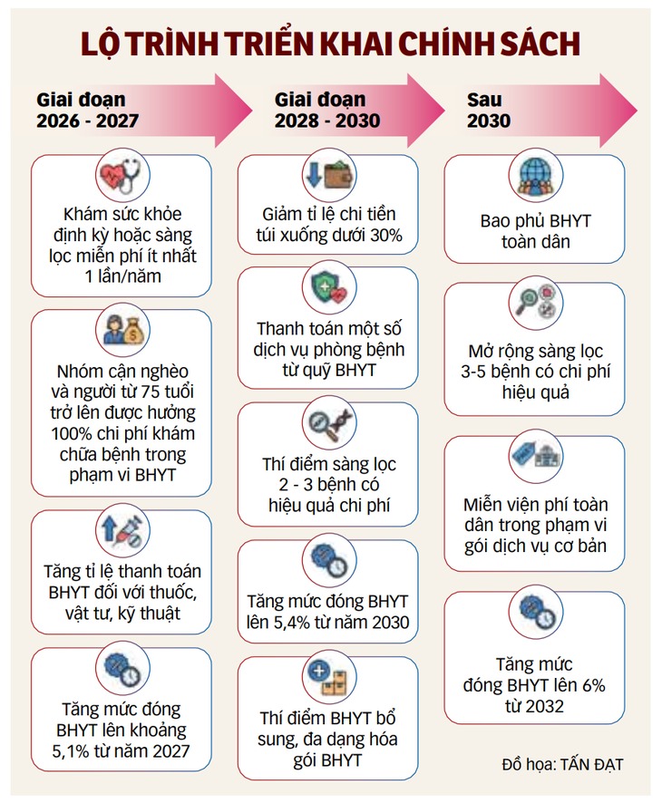 Đồng thời bình đẳng trong thụ hưởng, tức là tổ chức hệ thống y tế 3 cấp chuyên môn như Luật Khám bệnh, Chữa bệnh năm 2023, trong đó cấp khám chữa bệnh cơ bản phải được bố trí gần dân nhất và phải có đủ thuốc để điều trị cho nhân dân, mọi người dân tùy theo mức độ bệnh tật đều được thụ hưởng như nhau.