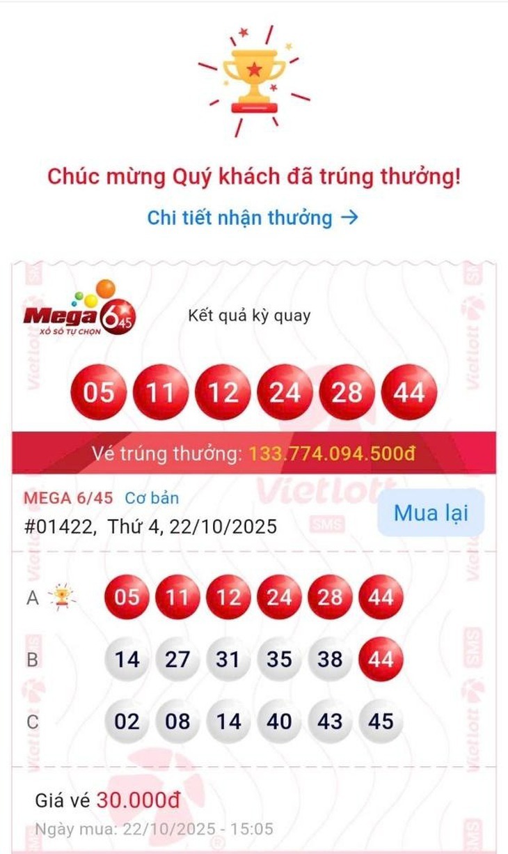 Nhờ đó, dãy số đã mang đến giải Jackpot Mega 6/45 trị giá hơn 133,7 tỉ đồng cho anh.