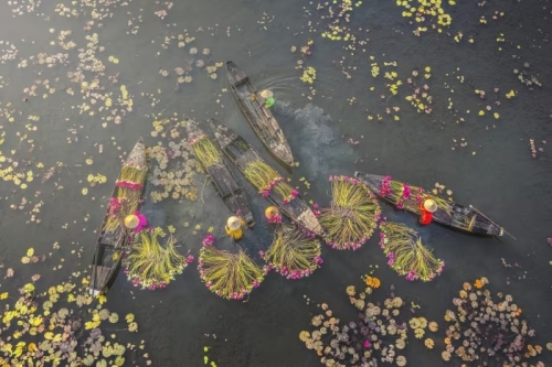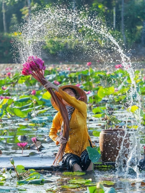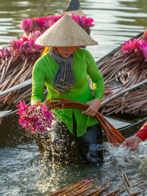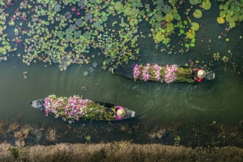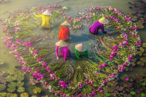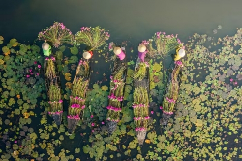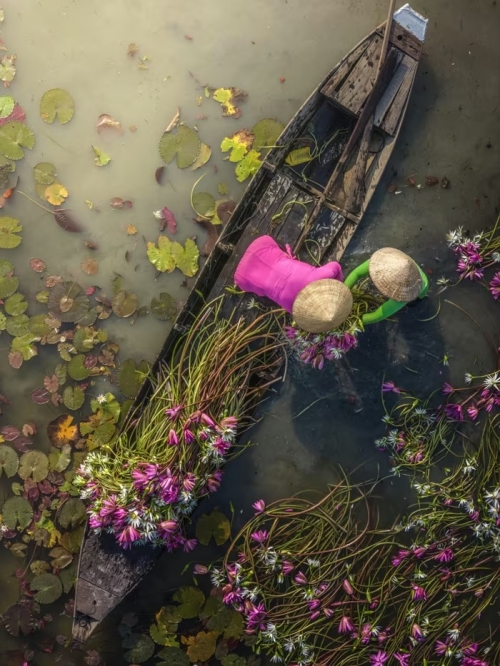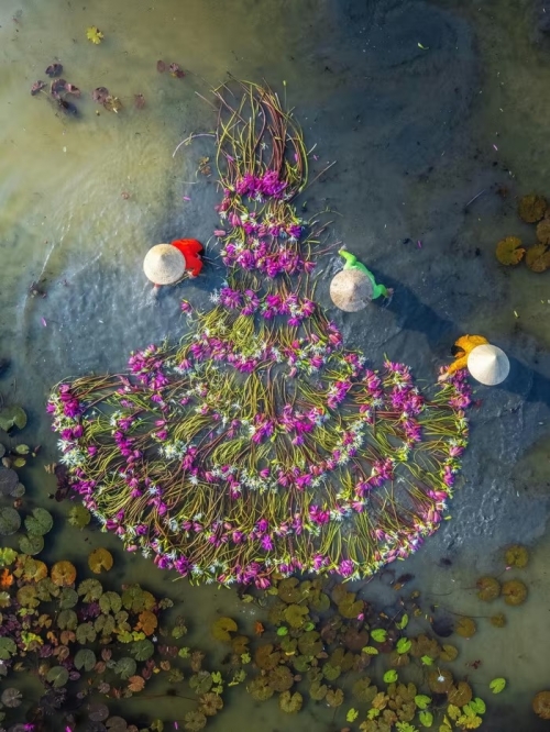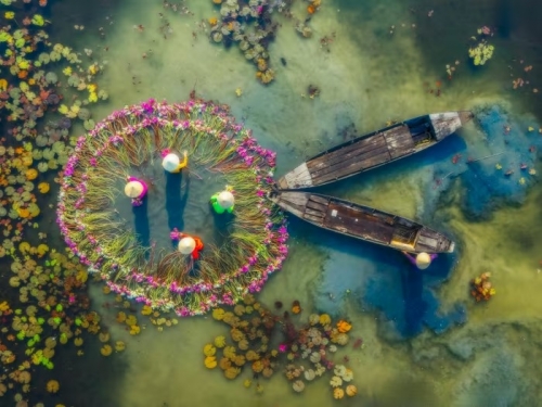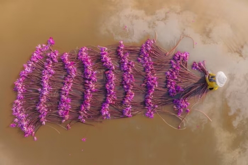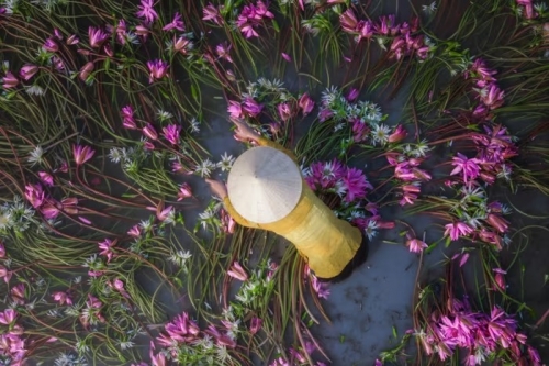 Theo nhiếp ảnh gia này, nổi bật nhất trên cánh đồng ngập nước là những bông súng màu hồng rực rỡ xen lẫn với sắc áo bà ba của phụ nữ miền Tây. Nhìn từ trên cao có thể cảm nhận sự dân dã và bình yên của miền sông nước, cảnh xếp hoa ngay ngắn đến hư ảo đến từ chính tâm huyết của người dân. Tất cả khung cảnh như bước ra từ trong ký ức.
