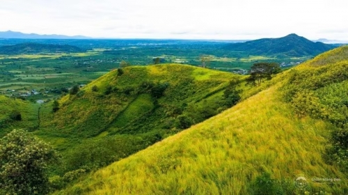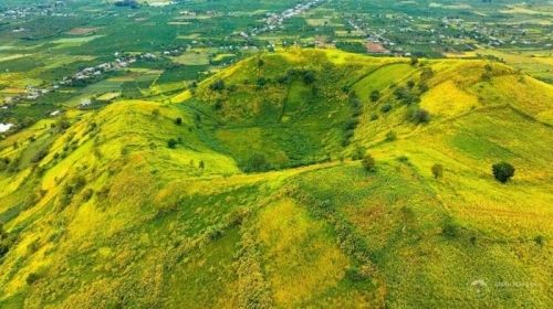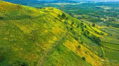 Từ trên cao nhìn xuống, thung lũng dưới chân núi hiện lên với những thửa ruộng xanh mướt, xen lẫn sắc vàng dã quỳ, tạo nên bức tranh thiên nhiên tuyệt đẹp, vừa hoang sơ vừa thơ mộng. |