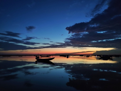 Hoàng hôn đầm Quảng Lợi mang đến không gian màu sắc bí ẩn. Ánh sáng yếu ớt sót lại len qua tầng mây, phản chiếu xuống làn nước như bức tranh trầm mặc. |