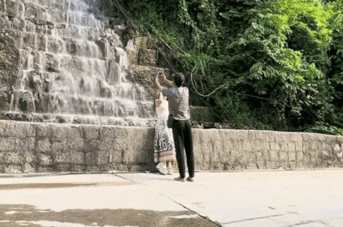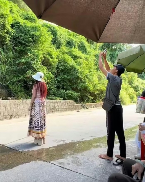 Để có những đoạn video mượt mà, người bán kem cầm chắc chiếc điện thoại trên tay, khéo léo di chuyển từ cao xuống thấp, chạy từ xa lại gần để ghi lại khung cảnh bầu trời, thác nước. Trong lúc quay, anh còn liên tục nhắc du khách phải tươi cười, vẫy tay. Kết lại bằng một cú lia máy ngang để thấy toàn bộ đoàn khách. Sau khi quay xong, anh tiếp tục bán kem cho khách đang đợi.