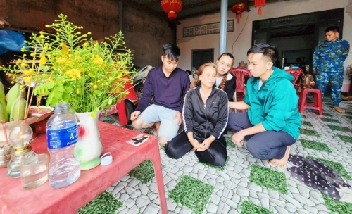 Chị Nguyễn Thị Kim Hoài (áo đen) bên bàn thờ vọng của anh Giản. (Ảnh: Thành Tâm) |