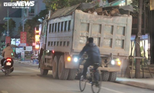Tại khu vực thị trấn Núi Đèo, huyện Thủy Nguyên, mặc dù có biển cấm đỗ nhưng khi nhập nhoạng tối, một đoàn xe tải chở đất đá tập kết ở đây thành hàng dài. Sau đó nối đuôi nhau đi dọc tuyến đường 359 hướng về khu vực cầu Bính, nơi có một số dự án đang thi công. |