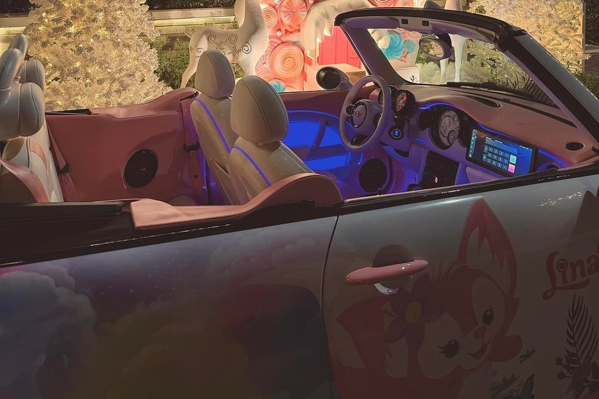 Chiếc Mini Cooper bản Convertible đươc dán wrap màu hồng trắng. Tại Việt Nam, mẫu xe có giá khởi điểm gần 2,4 tỷ đồng. |