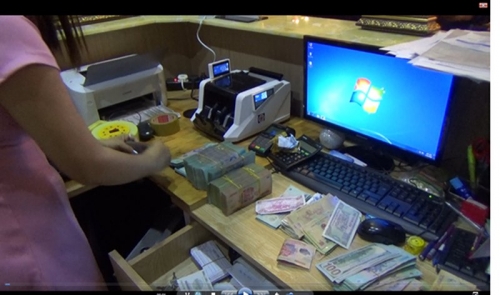 Tang vật tiền mặt và máy móc mà công an thu giữ |