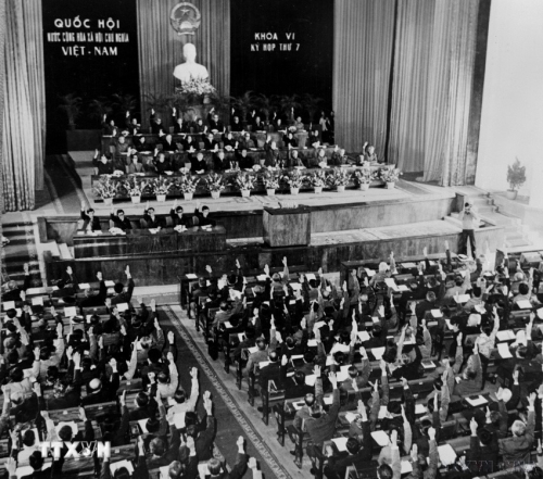 Các đại biểu quốc hội thông qua Hiến pháp mới của nước Cộng hòa xã hội chủ nghĩa Việt Nam tại Kỳ họp thứ 7, Quốc hội khóa VI. Đây là bản Hiến pháp thứ ba được Quốc hội thông qua để đáp ứng yêu cầu của nhiệm vụ chính trị trong giai đoạn mới. Hiến pháp 1980 đã khẳng định: “Nước Cộng hòa xã hội chủ nghĩa Việt Nam là một nước có chủ quyền, thống nhất và toàn vẹn lãnh thổ...” (18/12/1980). (Ảnh: Kim Hùng/TTXVN) |