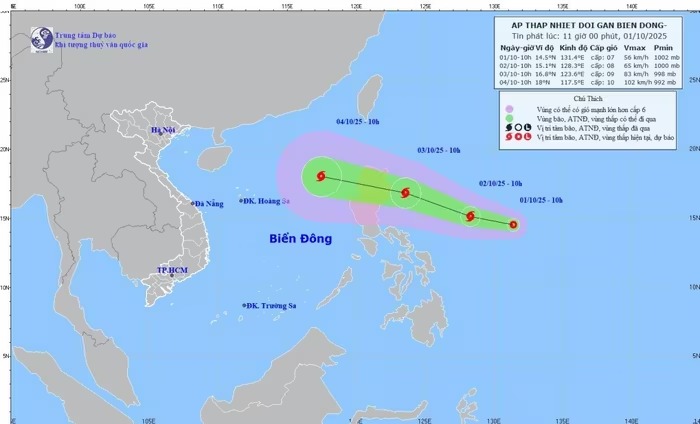 Theo Trung tâm dự báo Khí tượng Thủy văn quốc gia, sáng nay (1/10), vùng áp thấp ở vùng biển phía Đông đảo Luzon (Philippines) đã mạnh lên thành áp thấp nhiệt đới.