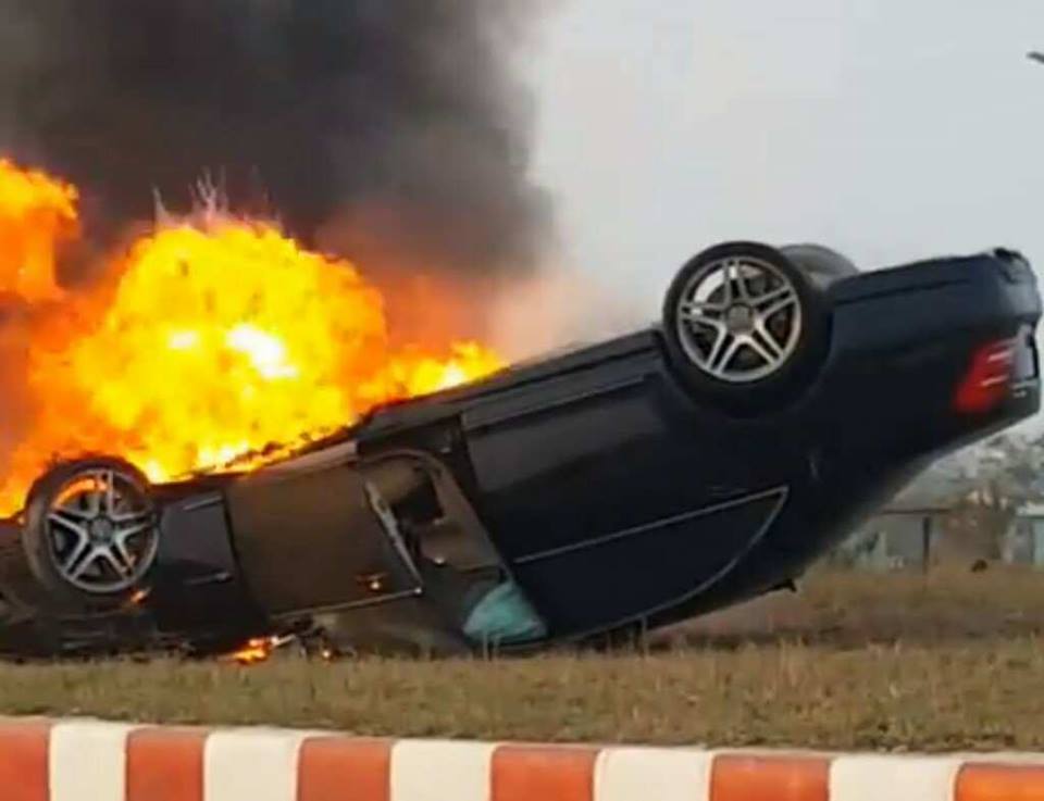 Xế hộp Audi lao lên vòng xuyến phơi bụng cháy rụi