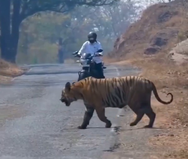 Người đàn ông đi xe máy chạm trán hổ dữ ở giữa đường và cái kết