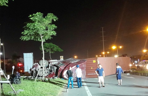Giải cứu tài xế mắc kẹt trong cabin container lật ngang ở Hải Phòng