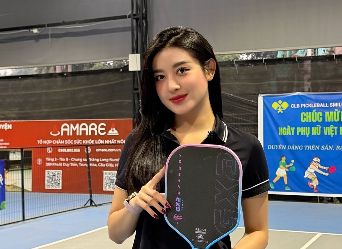 Ngọc Trinh ăn mặc kín đáo khi ra sân pickleball của vợ chồng Minh Hằng. Năm ngoái, cô từng bị chỉ trích vì diện đồ hở bạo khi chơi môn thể thao này.