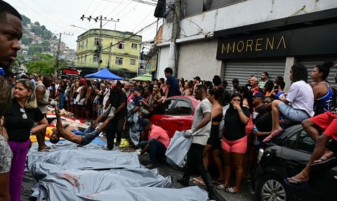 Ngày 29-10, người dân trong một cộng đồng ở TP Rio de Janeiro (Brazil) đã xếp các thi thể trên đường phố, sau cuộc đột kích đẫm máu của cảnh sát Brazil khiến ít nhất 119 người thiệt mạng.