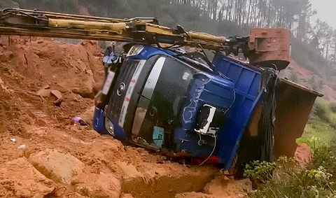 Sạt lở núi xô nghiêng máy múc và xe tải, hai công nhân bị thương