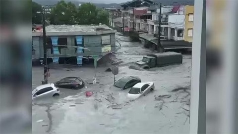 Một hồ nước vỡ bờ làm gãy cả cầu và ngập lụt một ngôi làng ở Hoa Liên, Đài Loan - Trung Quốc hôm 23-9, khi siêu bão Ragasa đang hướng tới.