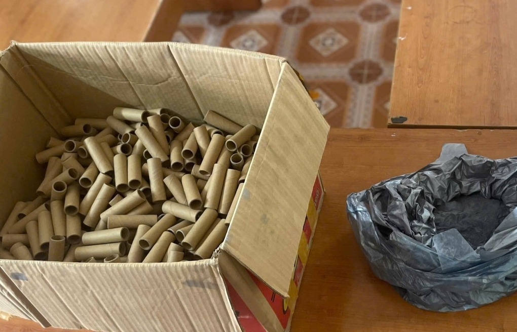 Tang vật thu giữ gồm 5 hộp pháo hoa nổ (tổng trọng lượng hơn 30kg); 1 bánh pháo nổ (hơn 1 kg); 16 quả pháo nổ tự tạo cùng một số vật dụng để chế tạo pháo nổ.