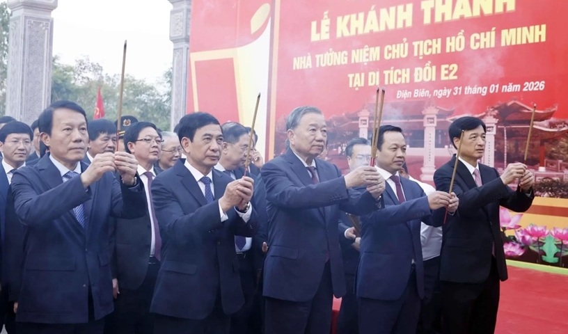 Sáng 31/1, Tổng Bí thư Tô Lâm và đoàn công tác dự lễ khánh thành nhà tưởng niệm Chủ tịch Hồ Chí Minh tại di tích đồi E2, phường Điện Biên Phủ.