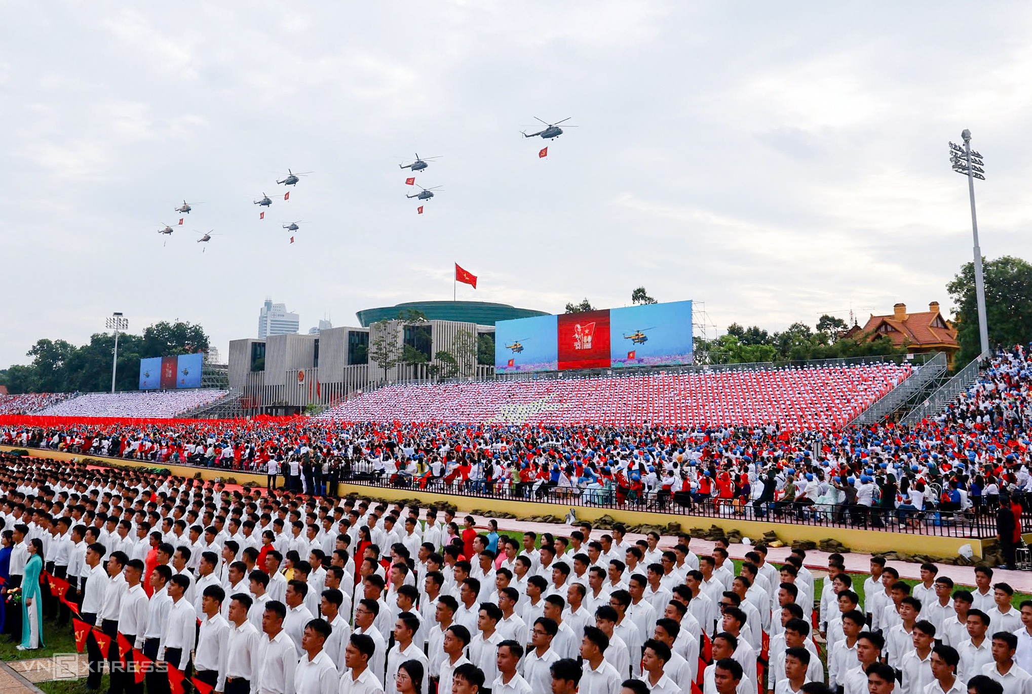 Lần đầu, 31 tiêm kích, trực thăng cùng tham gia tổng duyệt diễu binh với hơn 16.300 quân nhân và hàng chục khối xe pháo quân sự, xe đặc chủng công an trên quảng trường Ba Đình, sáng 30/8.