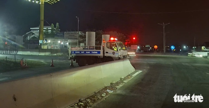Ngay trong đêm, lực lượng cảnh sát giao thông Công an tỉnh Lâm Đồng tiếp tục phối hợp cấm xe từ quốc lộ 1 vào cao tốc Phan Thiết - Dầu Giây tại nút giao Ba Bàu.