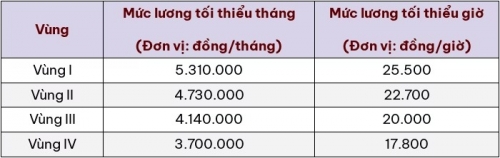 Quy định mức lương tối thiểu tháng và mức lương tối thiểu giờ đối với người lao động làm việc cho người sử dụng lao động theo vùng như sau: