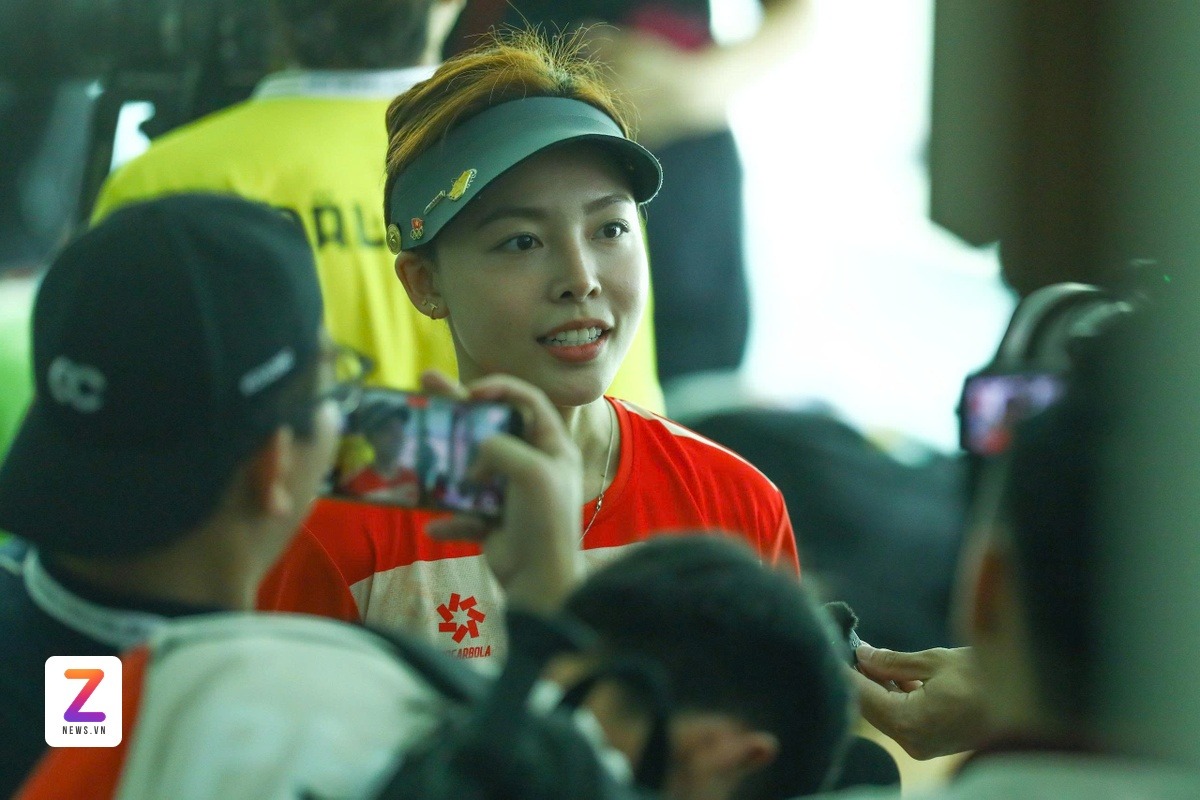 Từ lúc thi đấu đến phần giao lưu sau trận, Phí Thanh Thảo thu hút sự chú ý lớn từ những khán giả theo dõi bởi ngoại hình nổi bật và phong thái cực ngầu. VĐV sinh năm 2004 từ lâu nổi tiếng là "bông hồng thép", "hoa khôi" của làng thể thao. Ảnh: Minh Chiến. |