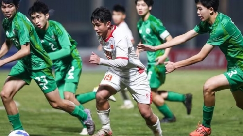 Chân sút U17 Việt Nam trong vòng vây của các cầu thủ U17 Ma Cao (Trung Quốc). |