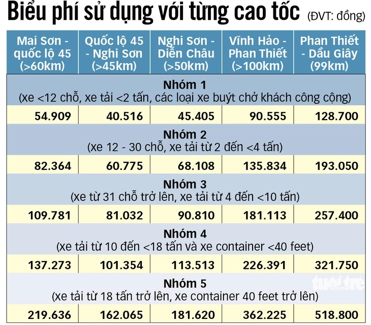 Mức phí các nhóm xe (mức phí cao nhất với mỗi nhóm) phải trả khi đi 5 đoạn tuyến đường cao tốc thu phí từ đêm 2-3-2026 - báo Tuổi Trẻ tổng hợp |
