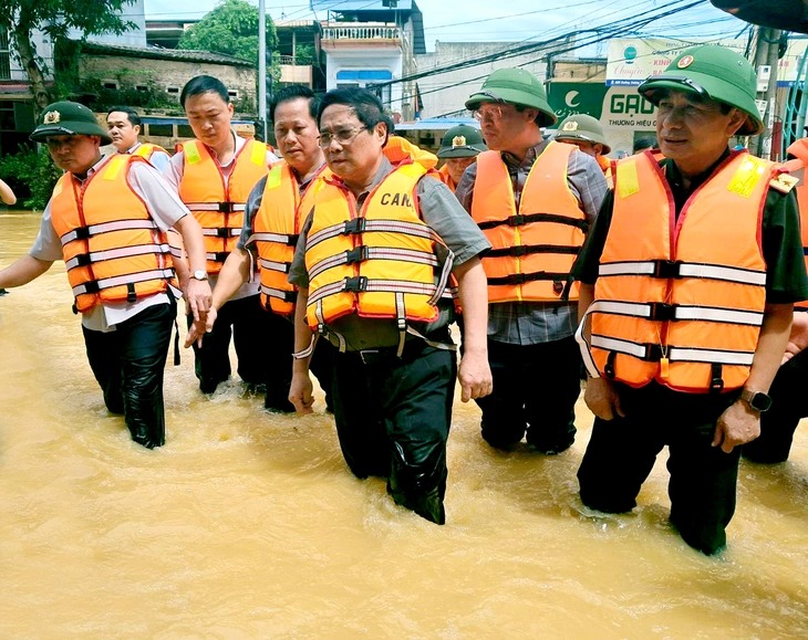 Thủ tướng Phạm Minh Chính lội nước lũ ở Thái Nguyên, yêu cầu cấp bách triển khai các biện pháp ứng phó, khắc phục hậu quả - Ảnh: VGP