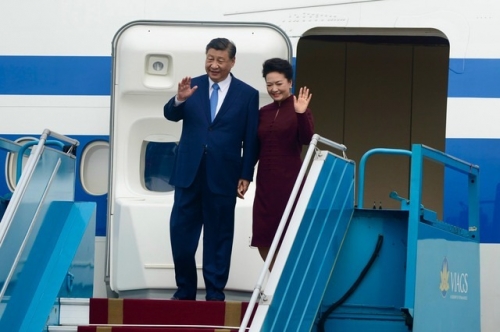 Tổng Bí thư, Chủ tịch nước Trung Quốc Tập Cận Bình và Phu nhân Bành Lệ Viên đến sân bay quốc tế Nội Bài. Ảnh: Hữu Hưng |
