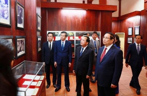 Thủ tướng Phạm Minh Chính cùng lãnh đạo các bộ, ngành tham quan nhà trưng bày các hình ảnh, hiện vật liên quan đến cuộc đời, sự nghiệp của cố Thủ tướng Phạm Văn Đồng |