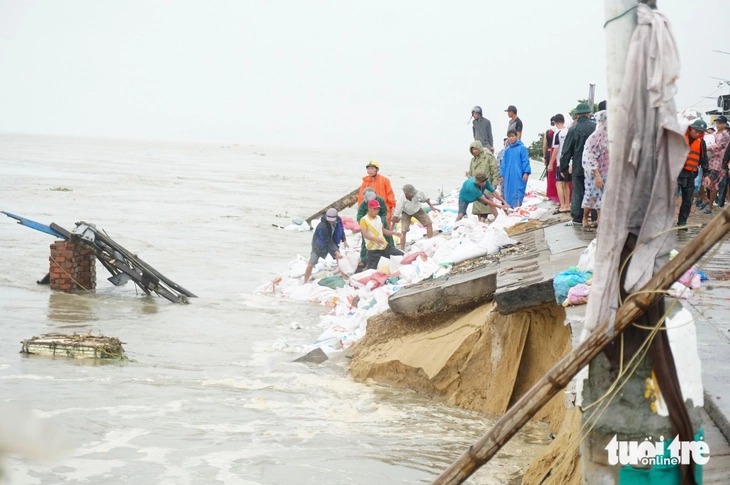 Thường trực Ban Bí thư Trần Cẩm Tú động viên lực lượng gia cố bờ kè bị sạt lở ở Duy Nghĩa - Ảnh: ĐOÀN CƯỜNG |