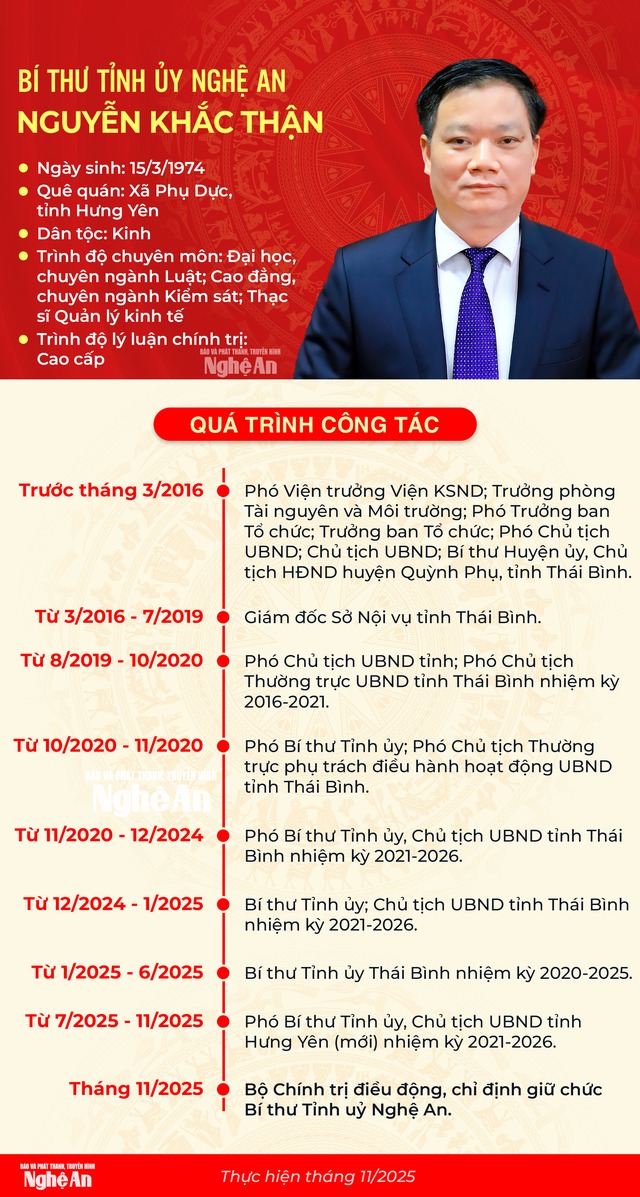 Tháng 11/2025, đồng chí Nguyễn Khắc Thận được Bộ Chính trị điều động, chỉ định giữ chức Bí thư Tỉnh ủy Nghệ An.