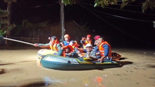 Mưa lớn trong ngày 27-10 khiến nhiều nơi ngập, lực lượng chức năng triển khai xuống cứu hộ đưa người dân đến nơi an toàn. |