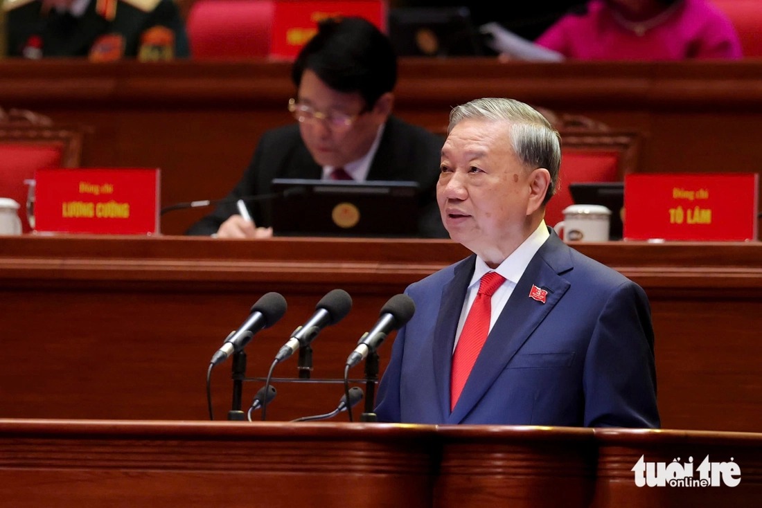 Tổng Bí thư Tô Lâm trình bày Báo cáo của Ban Chấp hành Trung ương khóa XIII về các văn kiện trình Đại hội XIV của Đảng - Ảnh: NGUYỄN KHÁNH |