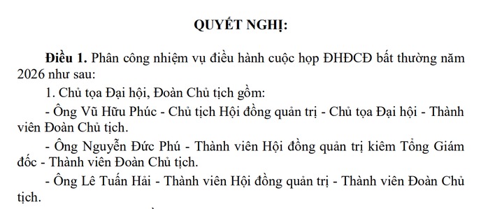 Theo nghị quyết, ông Vũ Hữu Phúc, Chủ tịch HĐQT, được phân công làm chủ tọa đại hội, thành viên đoàn chủ tịch, điều hành đại hội.