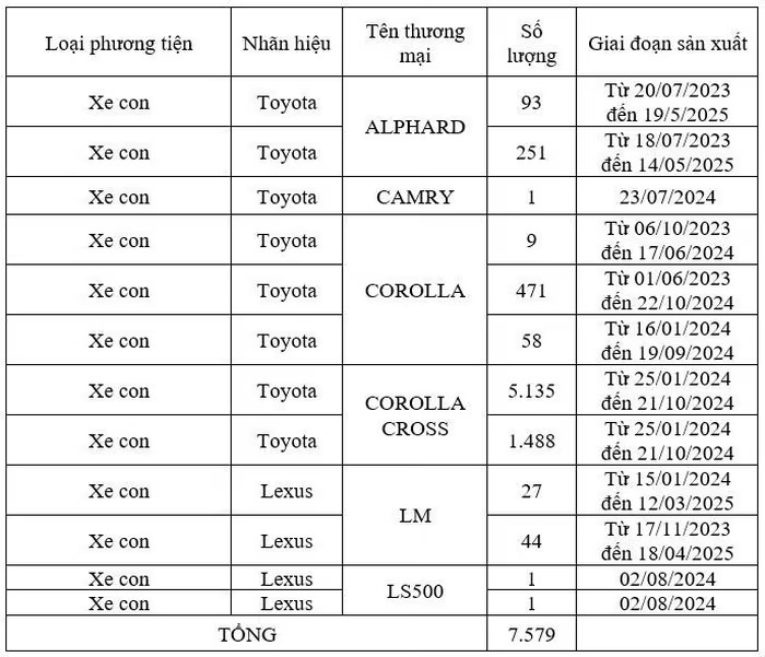 Cụ thể, có tổng cộng 7.579 xe thuộc nhiều mẫu khác nhau nằm trong diện ảnh hưởng, bao gồm Toyota Alphard, Camry, Corolla, Corolla Cross và các mẫu Lexus như LM, LS500.