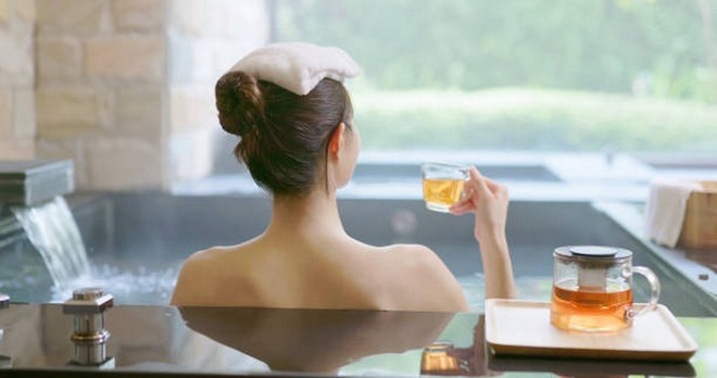 Ngâm mình trong bồn nước có pha trà xanh để làm dịu da và thư giãn.