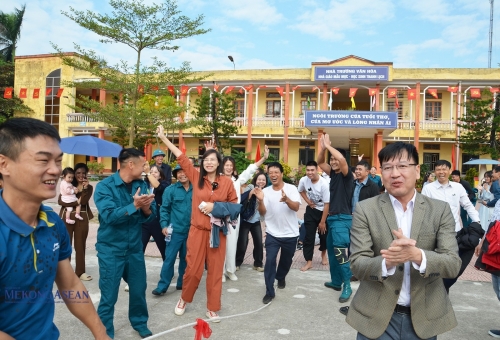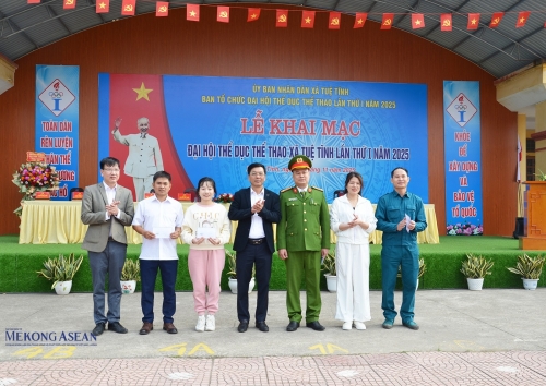 Lãnh đạo Đảng ủy, UBND xã Tuệ Tĩnh chúc mừng các đội tham gia và đoạt giải kéo co tại đại hội. Ảnh: Phùng Nguyện/Mekong ASEA |