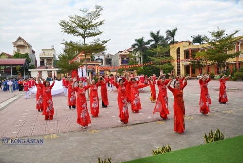 Tiết mục nhảy dân vũ của thôn Hoàng Gia, xã Tuệ Tĩnh. Ảnh: Phùng Nguyện/Mekong ASEAN |