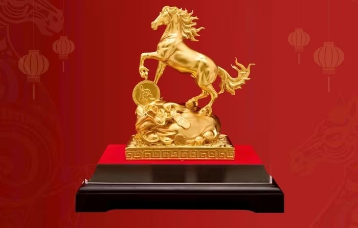 Thị trường quà tặng Tết Nguyên đán 2026 đang bước vào giai đoạn nhộn nhịp. Trong đó, đáng chú ý là tượng ngựa mạ vàng thu hút sự chú ý của người mua. Ảnh: Golden gift |