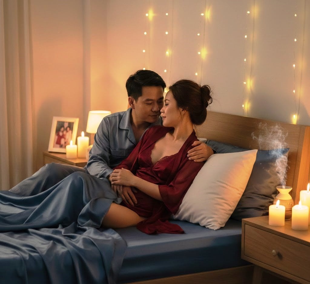 - Ánh sáng huyền ảo: Thay vì ánh đèn neon sáng choang, hãy thử dùng đèn ngủ ánh vàng hoặc nến thơm. Ánh sáng mờ ảo có khả năng che giấu những khuyết điểm cơ thể và tạo nên một bầu không khí lãng mạn, bí ẩn.